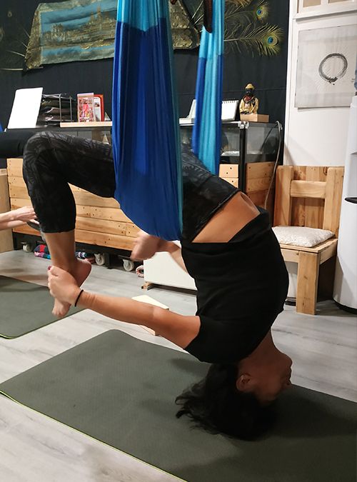 El yoga aéreo, una forma relativamente nueva de yoga, se practica en una hamaca o columpio suave suspendido del techo. Sus objetivos principales incluyen facilitar apoyos en posturas que de otro modo no podrías quizás hacer (como invertidas o equilibrios).